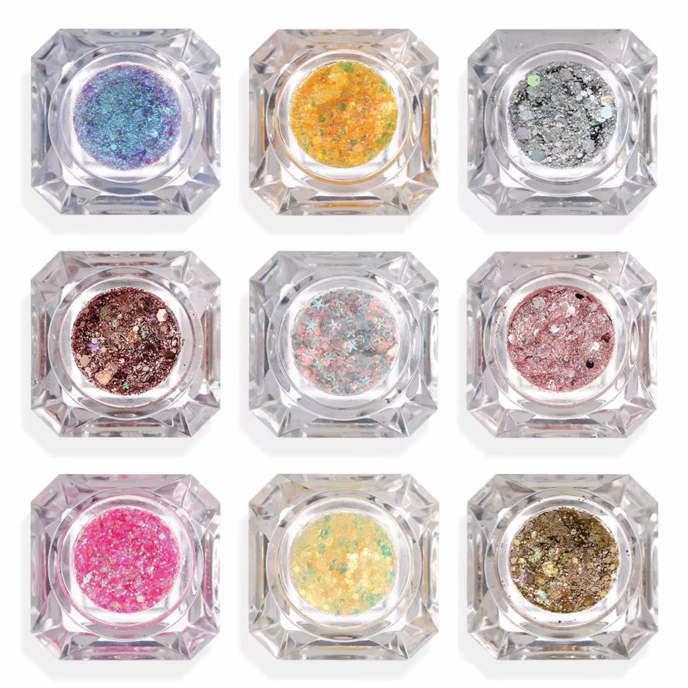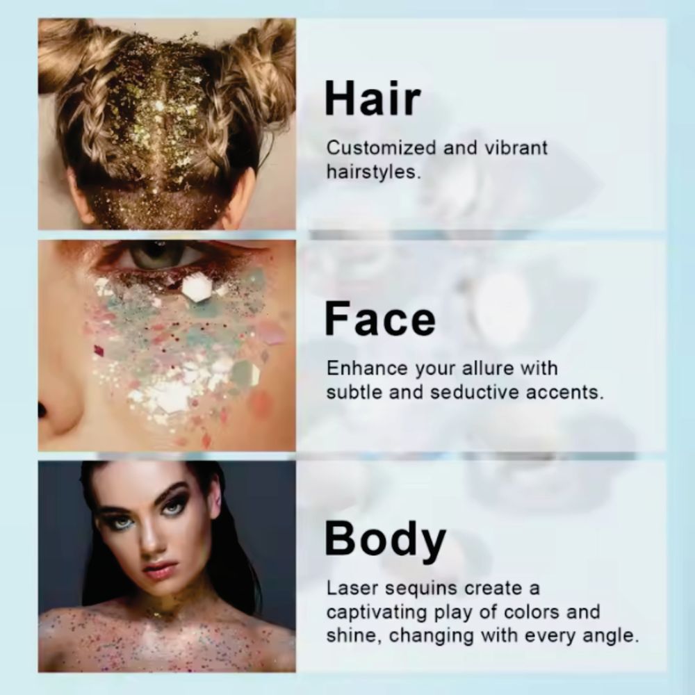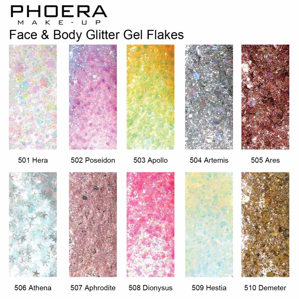 Phoera Face & Body Glitter Gel Flakes Light up any beauty look, with these lightweight, easy application multi-chrome flake toppers. No adhesive required. No fall out, no fuss, just magical bursts of colour!