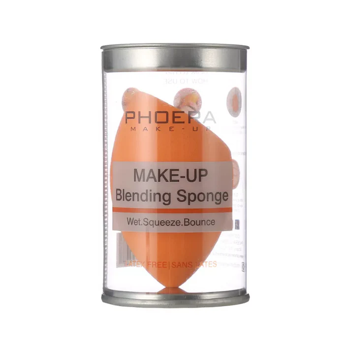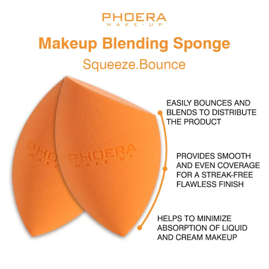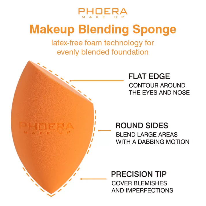 The beauty blender is shaped in a teardrop with the added feature of a flat, round surface. The PHOERA blender will easily apply and give you an airbrushed complexion.